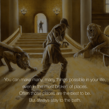 Christian faces many monsters and demons, forces that deceive and knock him down. They wound and trick him, but he does not relent. He gets back up and back on the path. Even though we do not face actual physical monsters and demons we do face them in a spiritual realm. Our journey, our relationships, health, career, our path is hit by monsters and demons and we learn as we get older our journey is far from perfect. There are many, many challenges and pitfalls along the way. We will veer in and out of the path, our focus bending, but not breaking. We will fall, but we get back up and try again. Through our heartache, despair, disappointment, struggles and failure it does work out like a da Vinci masterpiece. We go from glory to glory. But that “hell in the hallway” hurts.