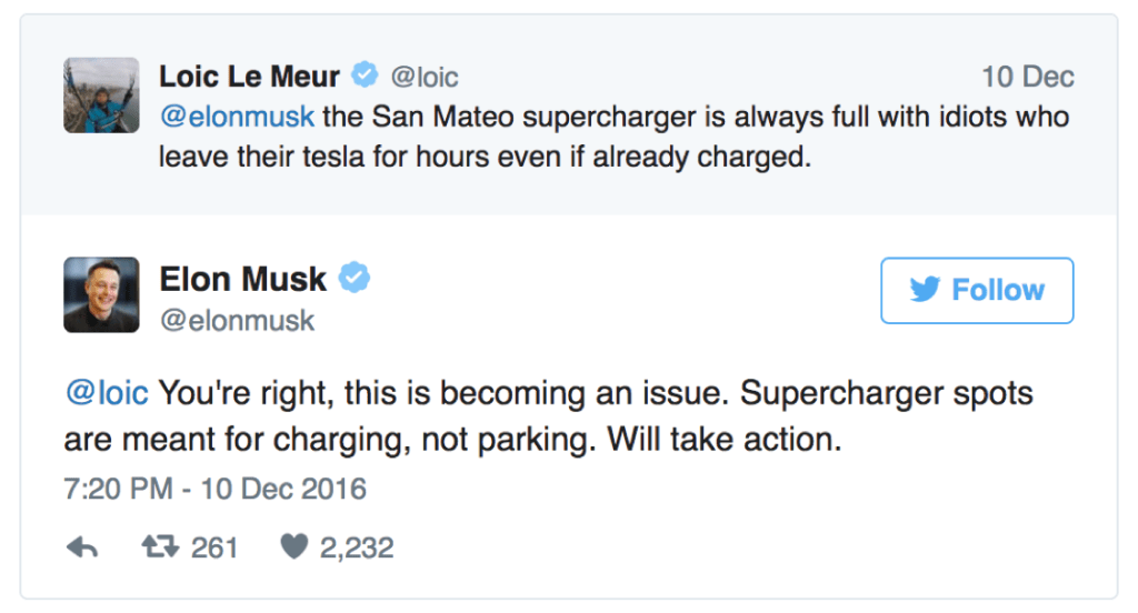 Musk has been known to personally respond via Twitter to customer complaints. He repeatedly demonstrates the industry benchmark way to respond – and in one of his finest examples to date, turned a customer complaint into a great product innovation.[3]