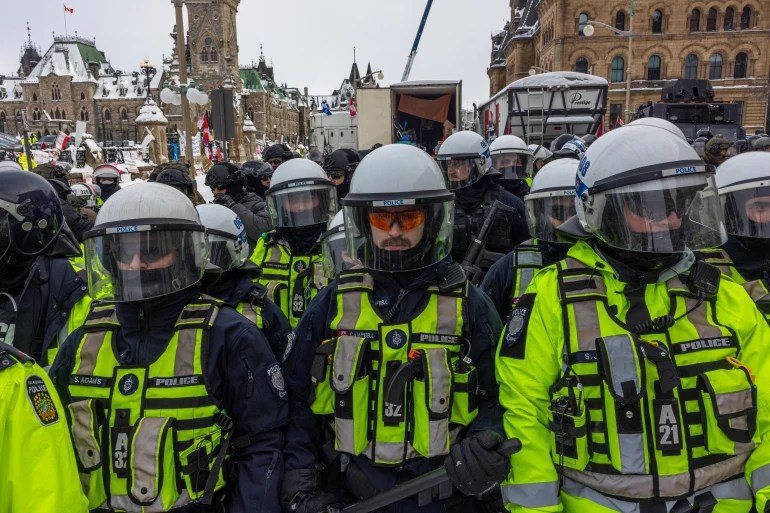 Ottawa police face off with demonstrators participating in a protest organized by truck drivers opposing vaccine mandates on Saturday [Alex Kent/Getty Images via AFP]