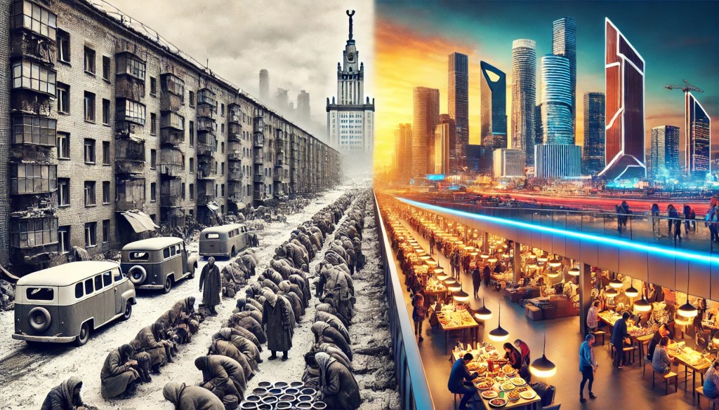 On the left, the bleak reality of Soviet-era hardship—crumbling buildings, endless bread lines, and a people bound by scarcity. On the right, the prosperity of modern capitalism—skyscrapers, thriving markets, and an abundance of opportunity. A stark reminder that economic systems determine not just wealth, but the quality of life itself.