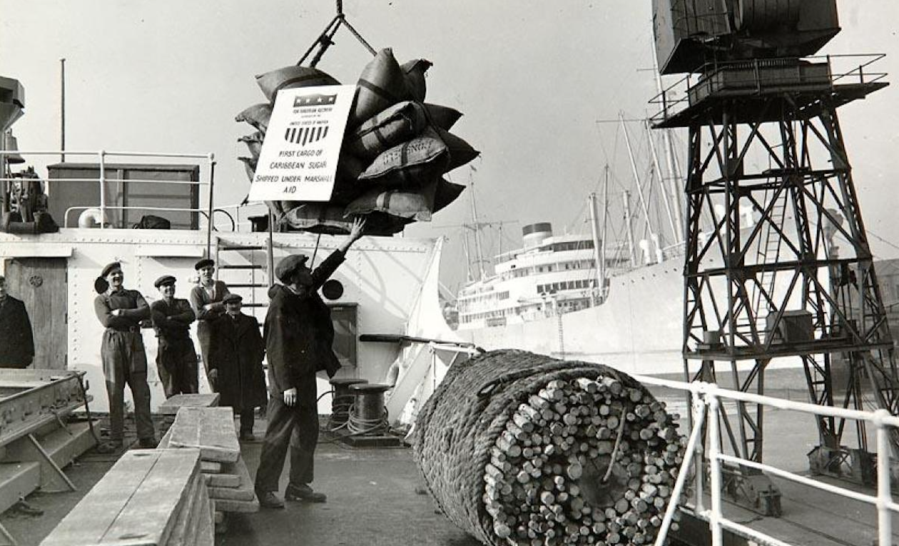 From Caribbean shores to a rebuilding Europe, the first Marshall Aid sugar shipment lifts off—sweet fuel for a continent rising from the ashes.
