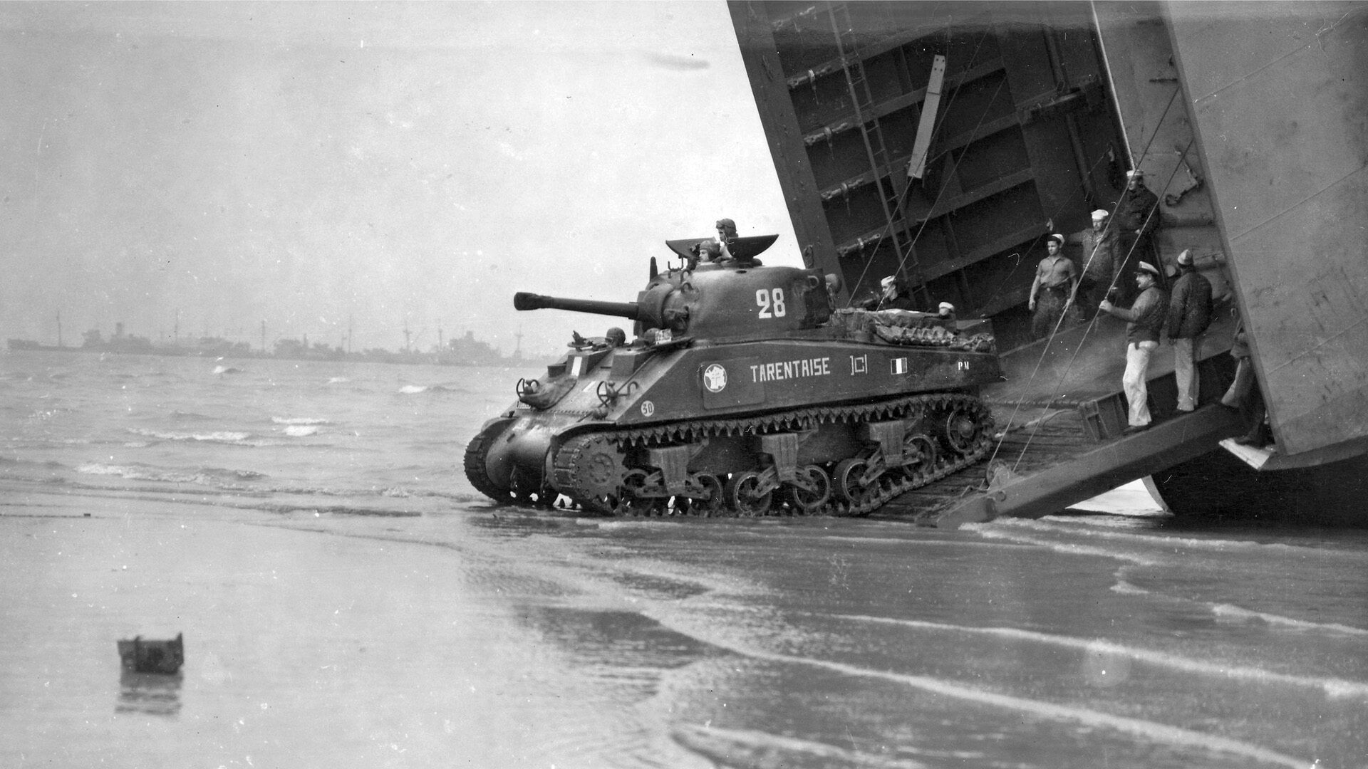 An M4 Sherman tank rolls onto the beaches of Normandy on June 6, 1944. This is what courage looked like then. Courage in 2025 asks something different: not landing tanks, but steering our most powerful technologies toward human dignity.