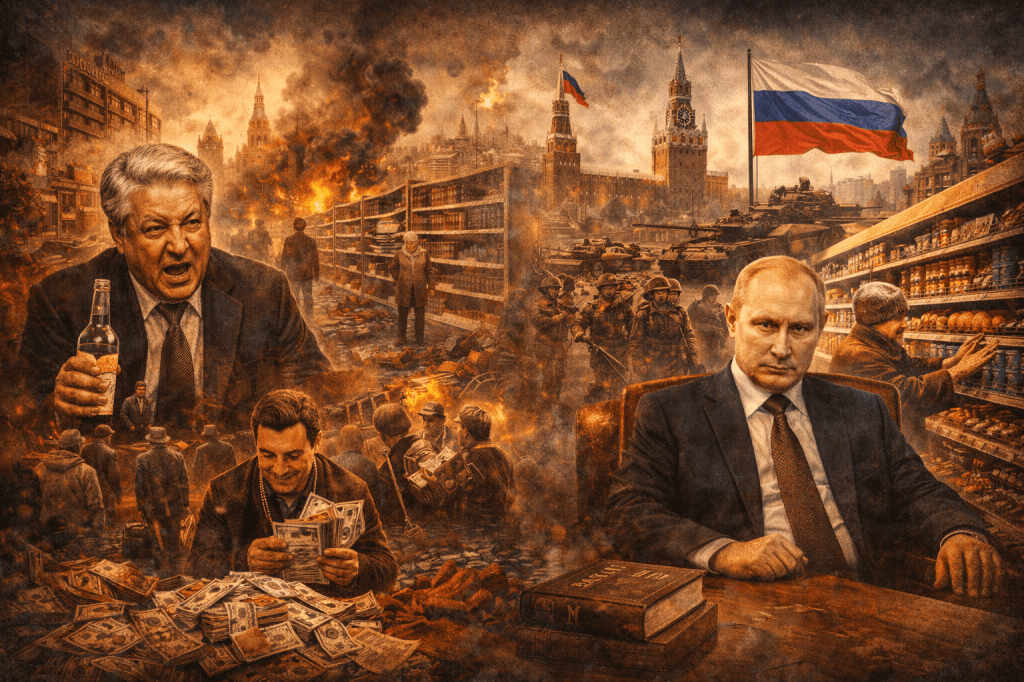 Instead, the 1990s arrived like a car crash. Shock therapy without seatbelts. Oligarchs strip mining the state. Ordinary people associating “freedom” with chaos, humiliation, and empty shelves.